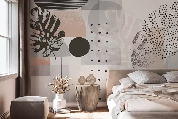 Fotomurales Estampado abstracto con formas geométricas y hojas tropicales de monstera, círculos, puntos y líneas, diseño moderno y minimalista Nr. w09333