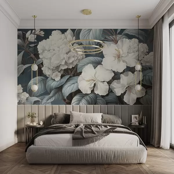 Fotomurales Flores tropicales blancas con delicados pétalos y hojas en un fondo azul oscuro, estilo vintage texturizado, ilustración botánica Nr. w09334