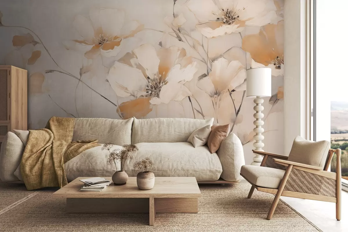 Fotomurales Flores blancas y anaranjadas con largos tallos, fondo claro, colores suaves, composición elegante, pinceladas delicadas Nr. w09335