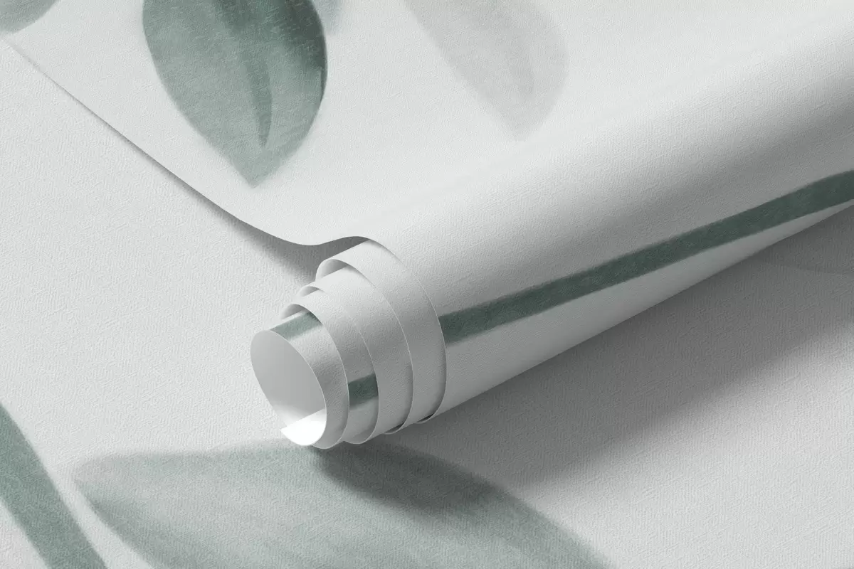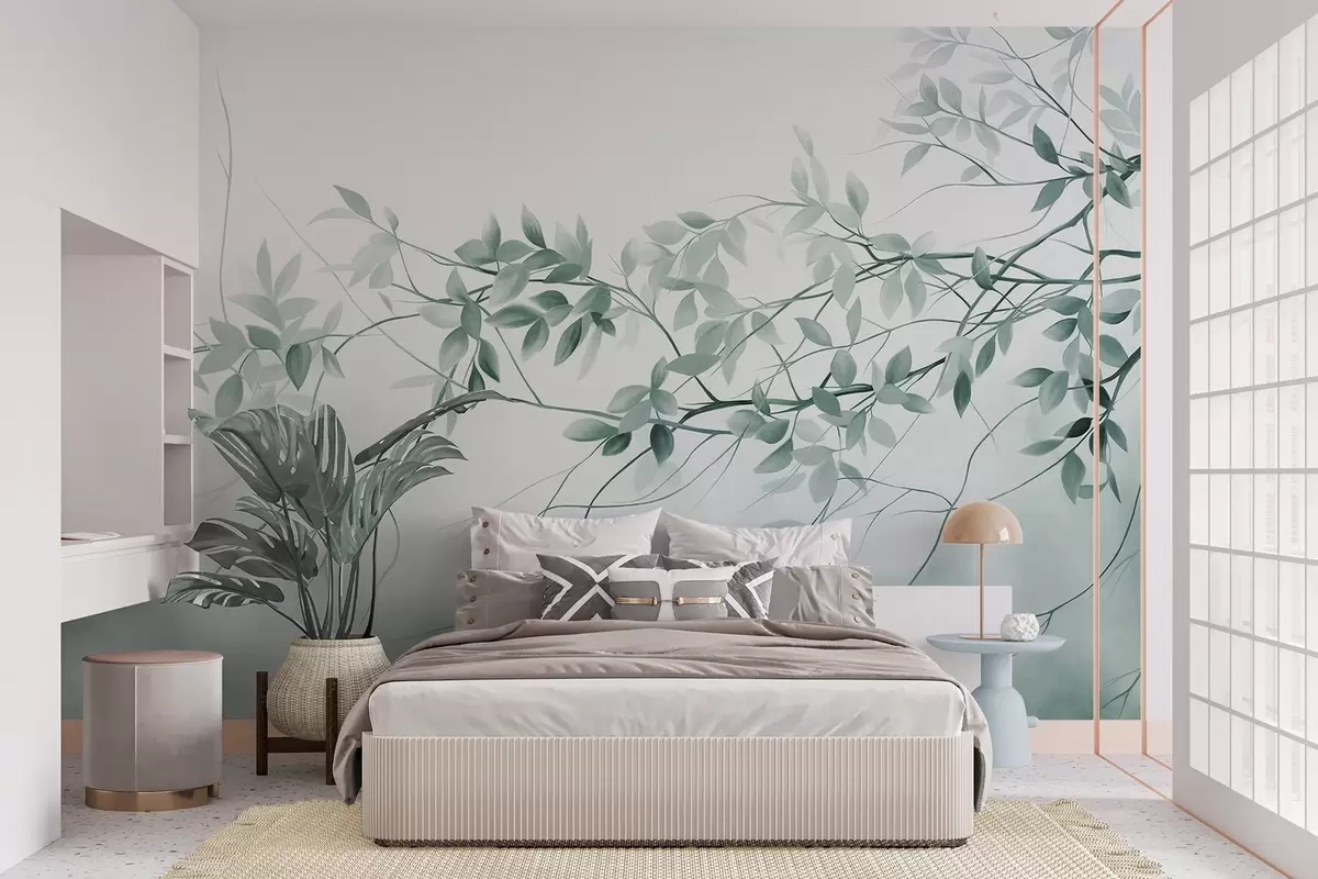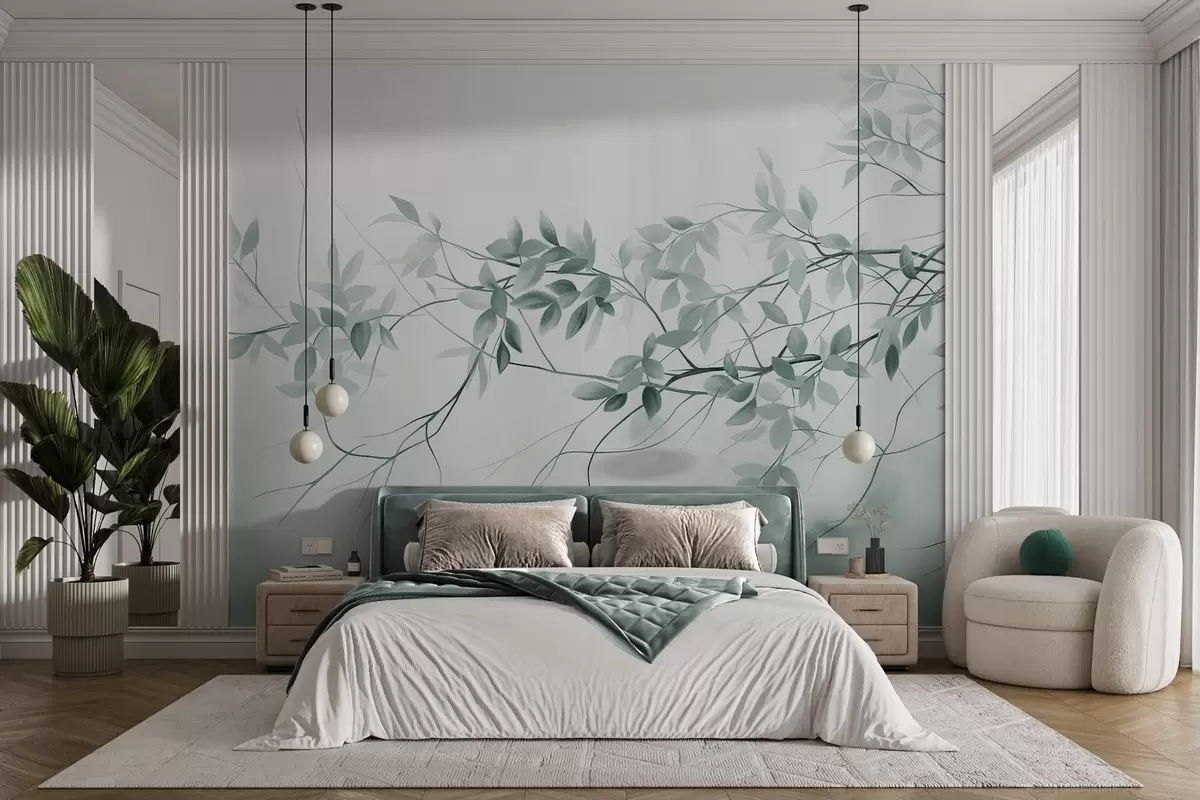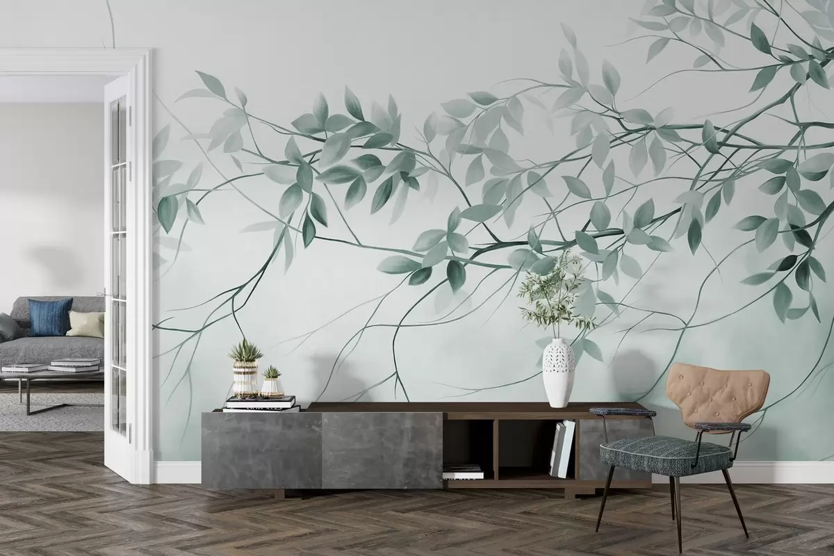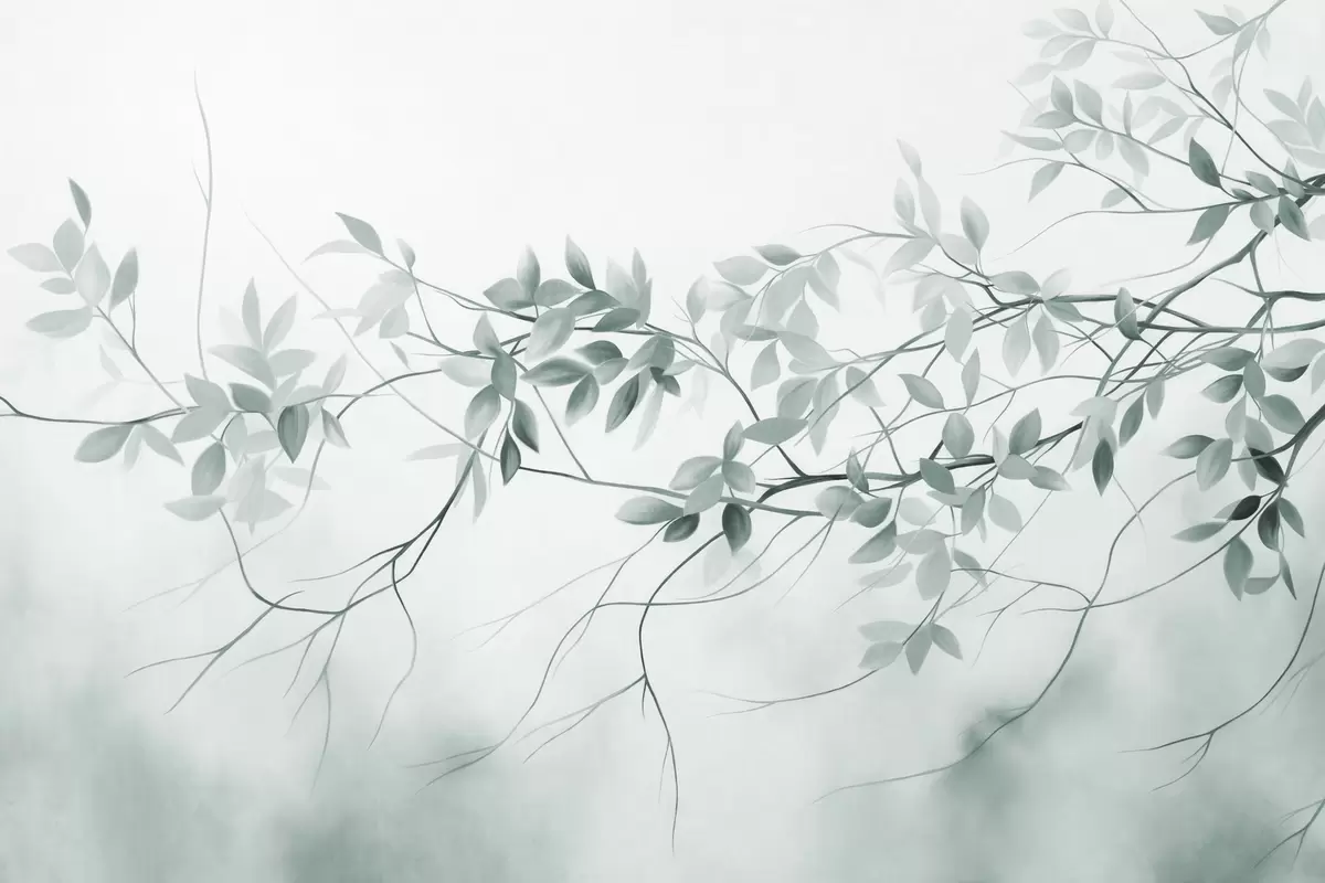 Fotomurales Ramas de textura delicada con hojas de tonos grises y verdes apagados sobre un fondo suave y difuminado. Nr. w09336v1