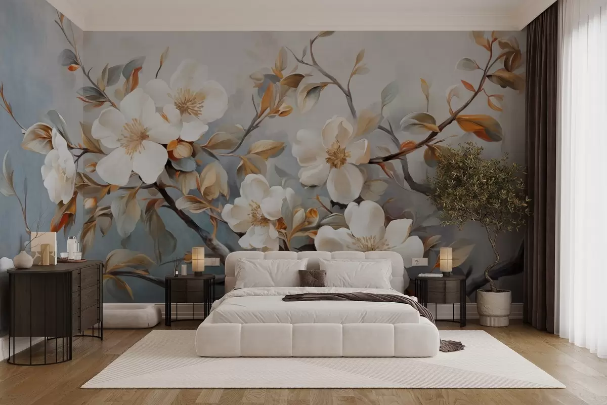 Fotomurales Flores blancas con pistilos amarillos en una rama de árbol con hojas, fondo claro, estilo de pintura vintage, impresión texturizada Nr. w09368