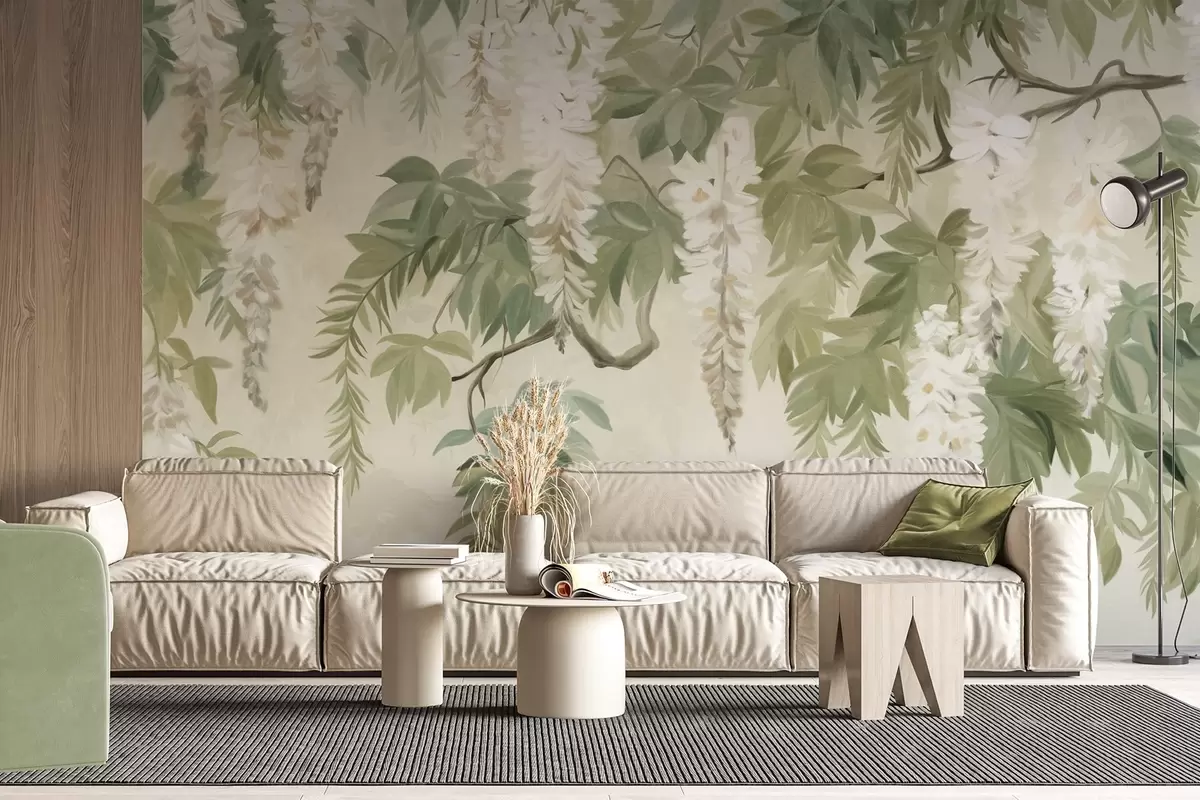Fotomurales Ramas de glicinas con flores blancas y hojas verdes, fondo verde, estilo de pintura vintage con textura Nr. w09375