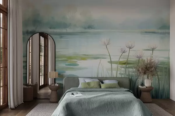Fotomurales Paisaje con un lago, nenúfares y hojas de nenúfar, árboles al fondo, en un entorno tranquilo, tonos azul claro y verde Nr. w09395