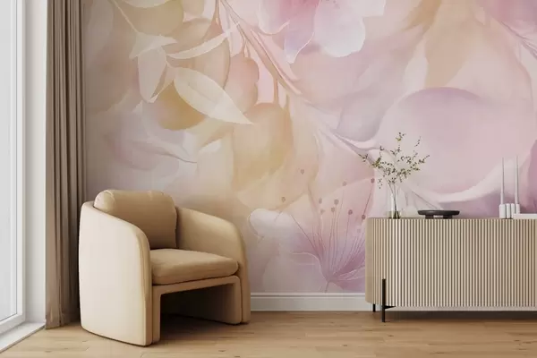Fotomurales Arte floral con flores, hojas y ramas en tonos amarillos y morados apagados, colores pastel suaves y efecto texturizado de acuarela Nr. w09397v2