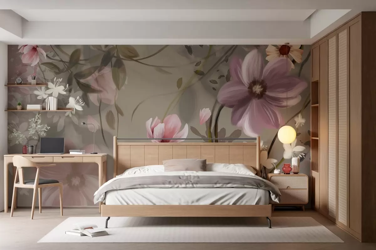 Fotomurales Flores rosas y blancas con tallos y hojas marrones, iluminación suave, colores apagados, arreglo floral Nr. w09417