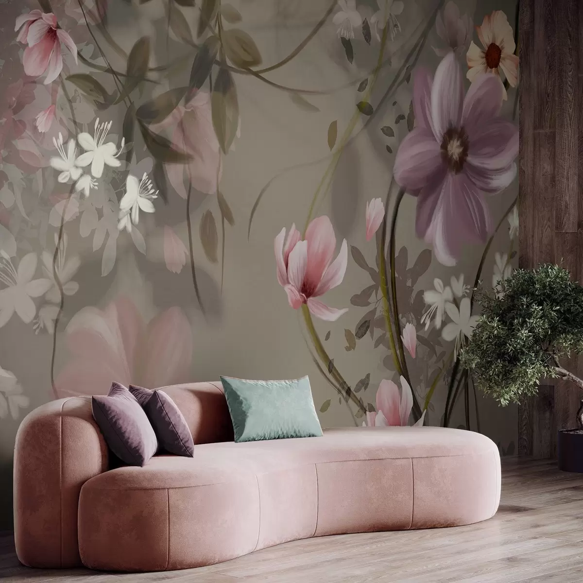 Fotomurales Flores rosas y blancas con tallos y hojas marrones, iluminación suave, colores apagados, arreglo floral Nr. w09417