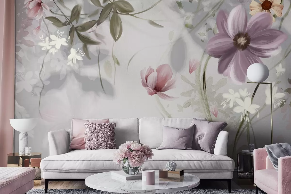 Fotomurales Flores rosas y blancas con tallos y hojas verdes, iluminación suave, colores apagados, arreglo floral Nr. w09417v1