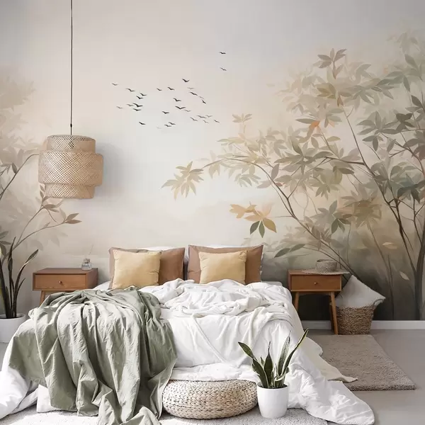 Fotomurales Paisaje texturizado con árboles y una bandada de pájaros volando en el cielo, colores pastel, escena natural Nr. w09418