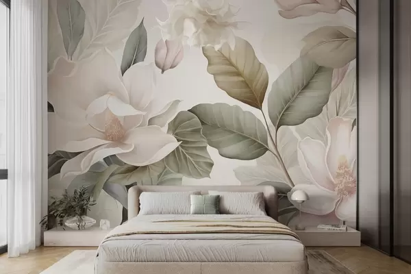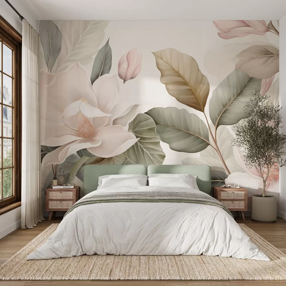 Fotomurales Flores de magnolia con hojas en colores pastel, blanco, rosa y verde, suaves, delicadas, estilo acuarela Nr. w09427