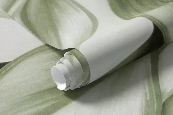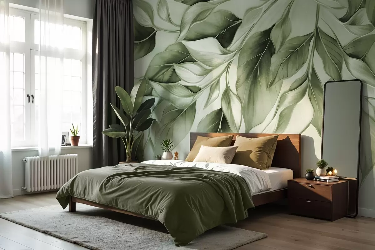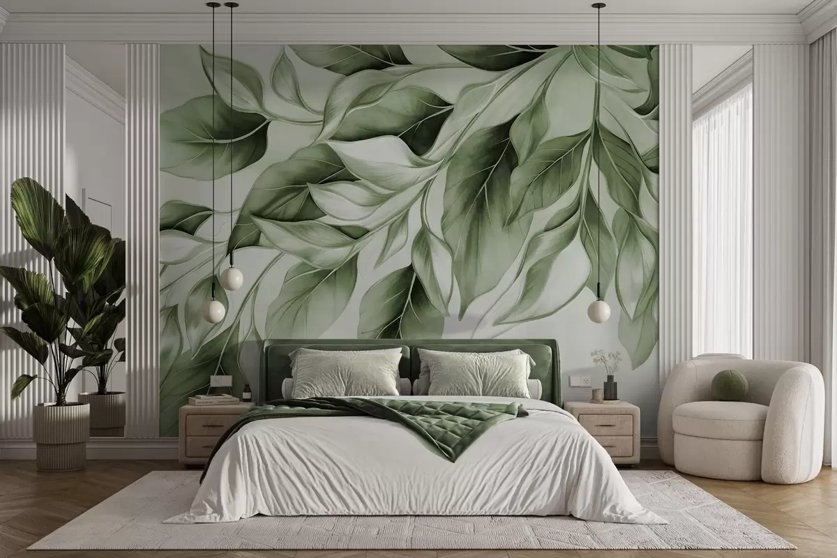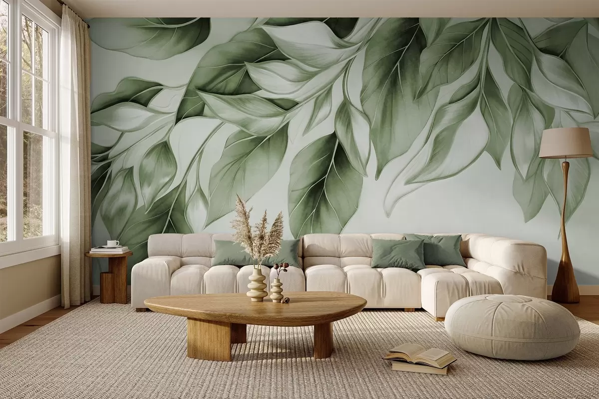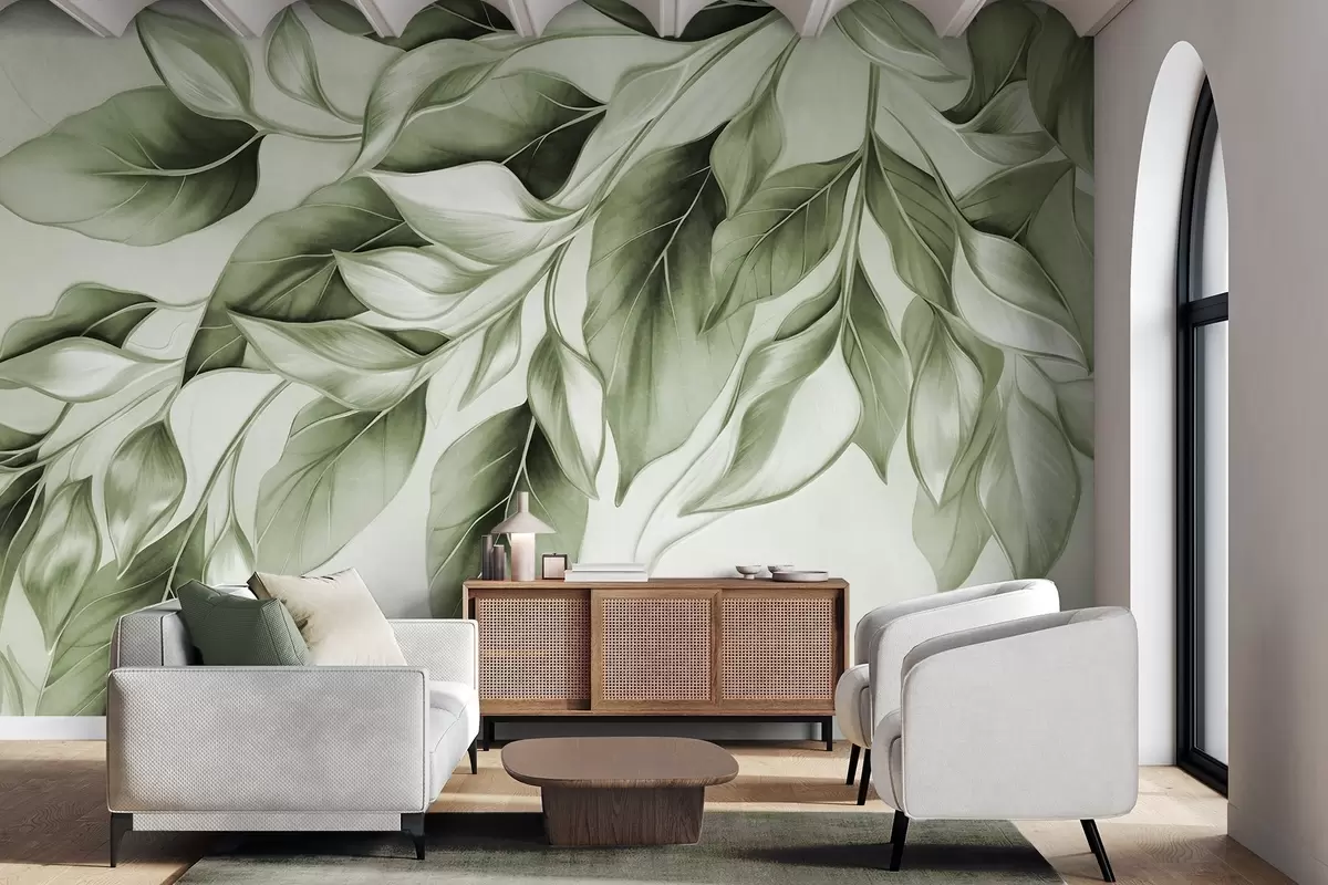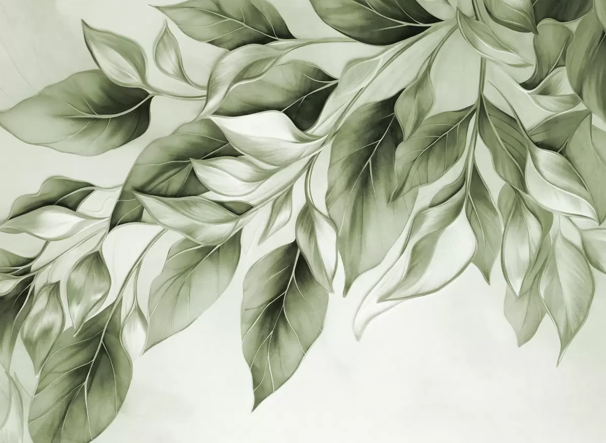 Fotomurales Hojas verdes apagadas con textura, fondo claro, diseño elegante y artístico, estilo moderno. Nr. w09429v1