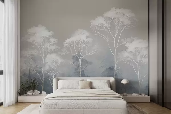 Fotomurales Árboles minimalistas en tonos azul grisáceos, en la niebla Nr. w09448