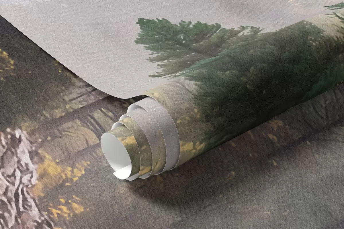Fotomurales Bosque de pinos brumoso y evocador en las montañas Nr. w09463