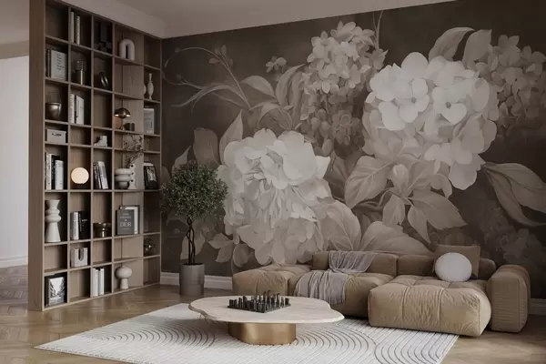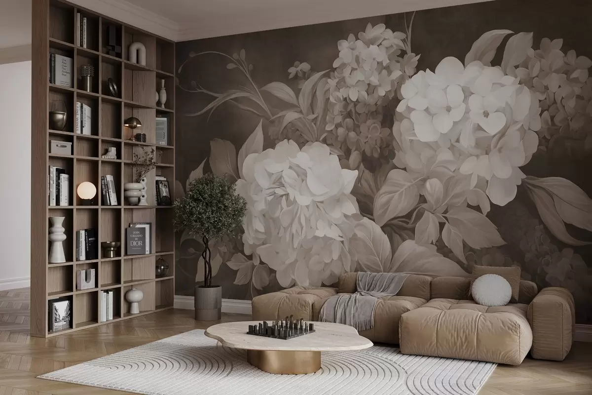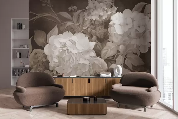 Fotomurales Pintura texturizada en sepia imitando flores de hortensias con hojas grandes, fondo abstracto y oscuro Nr. w09465