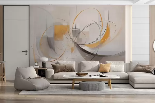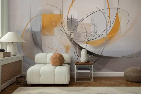 Fotomurales Estilo pictórico moderno abstracto con texturas, líneas curvas y formas geométricas en tonos grises, blancos y naranjas Nr. w09476