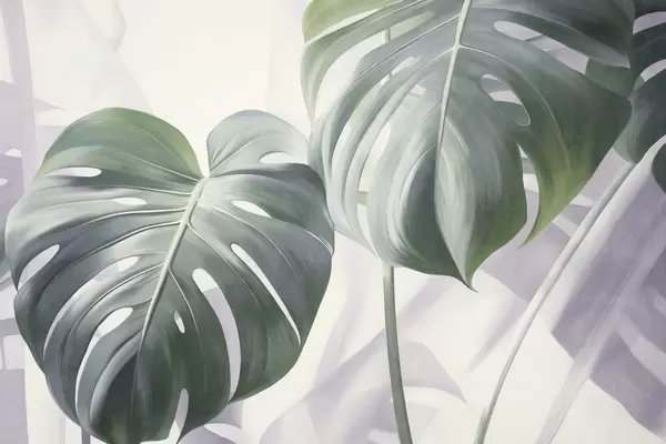Fotomurales Hojas de monstera texturizadas, grandes y verdes, sobre un fondo abstracto suave y claro. Nr. w09477