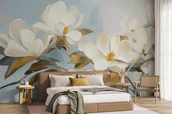 Fotomurales Magnolias blancas con hojas verdes sobre fondo azul claro con imitación de pinceladas abstractas. Nr. w09478
