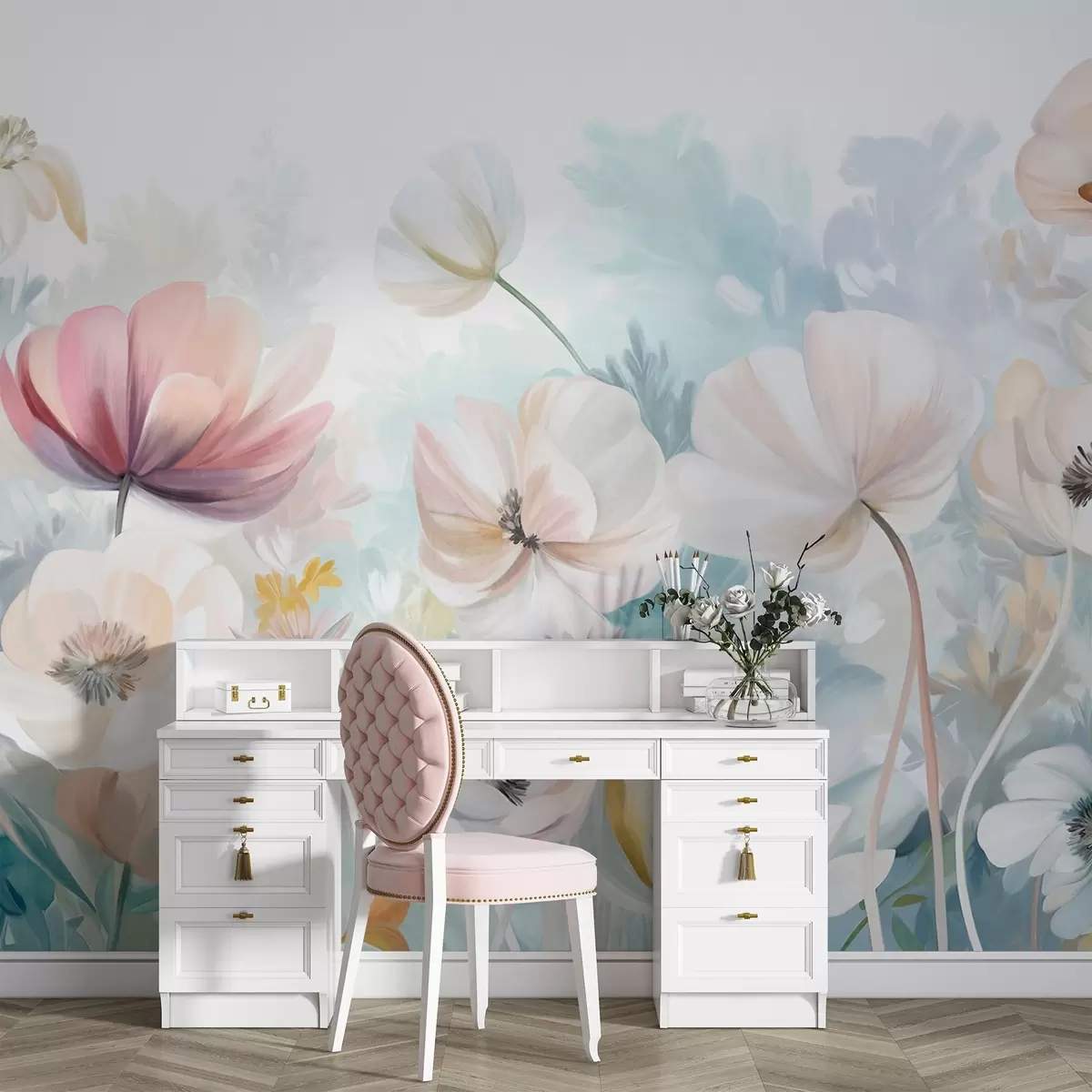 Fotomurales Un campo de flores en tonos pastel con delicados pétalos y suaves hojas verdes, en un estilo acuarela onírico y texturizado Nr. w09481