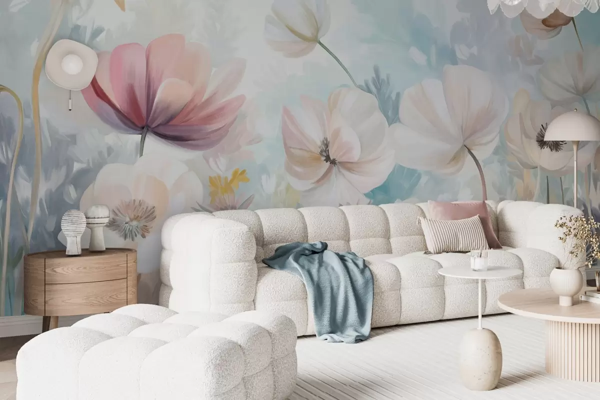 Fotomurales Un campo de flores en tonos pastel con delicados pétalos y suaves hojas verdes, en un estilo acuarela onírico y texturizado Nr. w09481