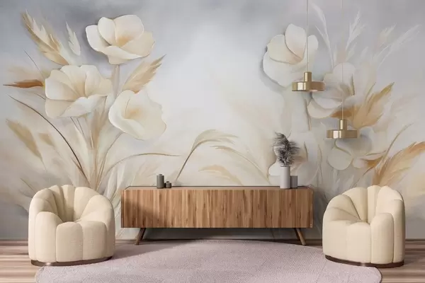 Fotomurales Flores blancas, juncos beige y hierba de la pampa, texturizado, elegante, estilo minimalista, fondo abstracto paisajístico Nr. w09490