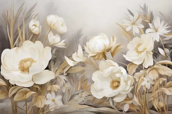 Fotomurales Peonías blancas y amarillas y otras flores con hierba alta y hojas en un estilo suave y pictórico con textura. Nr. w09494
