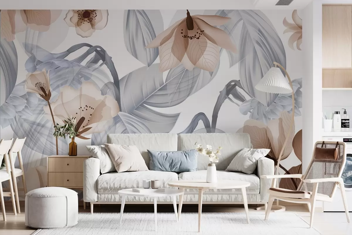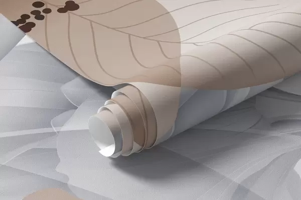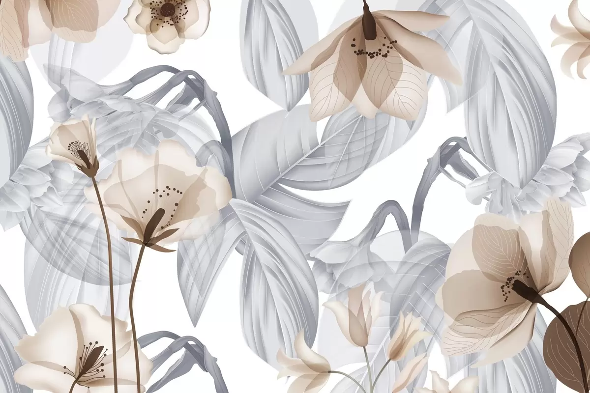 Fotomurales Flores marrones y hojas grises, fondo botánico floral, diseño elegante, colores suaves, detalles delicados y ligeros Nr. w09497v1