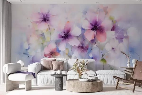 Fotomurales Flores primaverales en acuarela en tonos rosa y morado. Nr. w09502