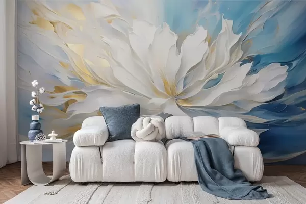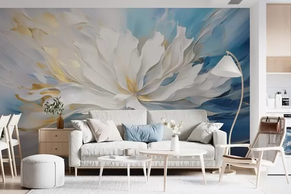 Fotomurales Gran peonía blanca en estilo pintura al óleo sobre fondo azul y amarillo. Nr. w09511