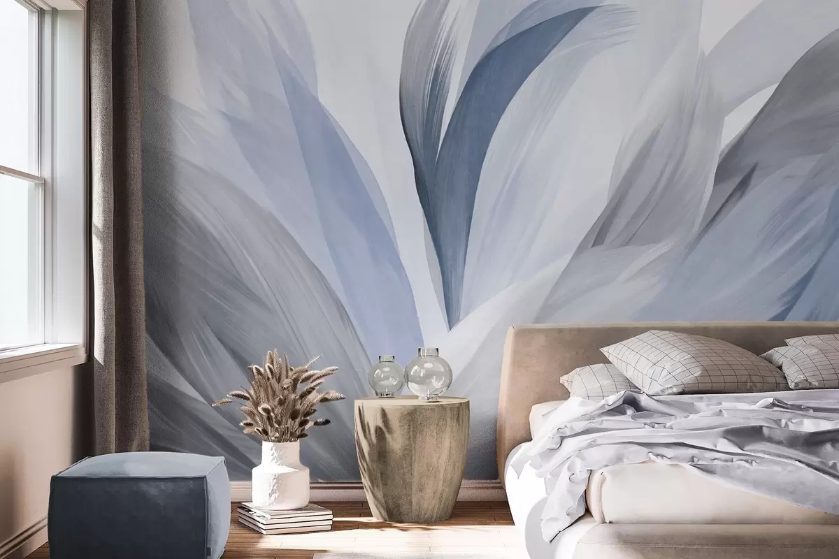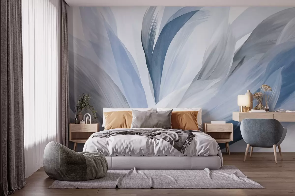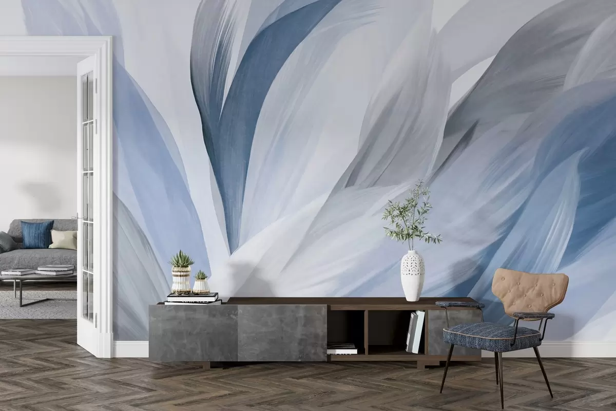 Fotomurales Plumas abstractas con textura en azul, blanco y gris y varios tonos, superpuestas sobre un fondo blanco. Nr. w09531v1