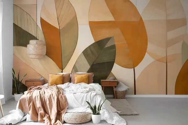 Fotomurales Hojas abstractas grandes en tonos naranjas, marrones y verdes, con textura, dispuestas sobre un fondo claro Nr. w09539