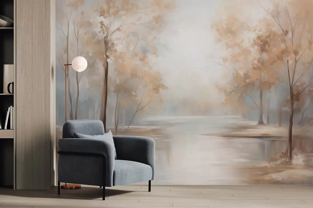 Fotomurales Paisaje otoñal con árboles y un río, colores suaves, atmósfera ligera y aireada, escena pacífica y tranquila. Nr. w09541