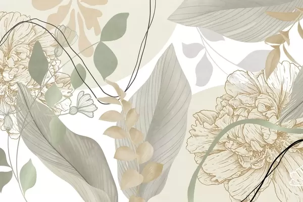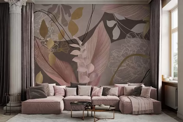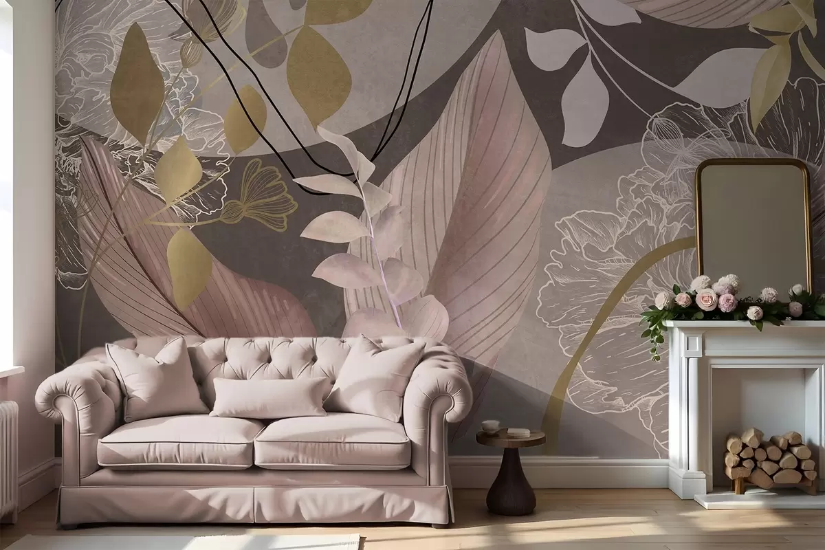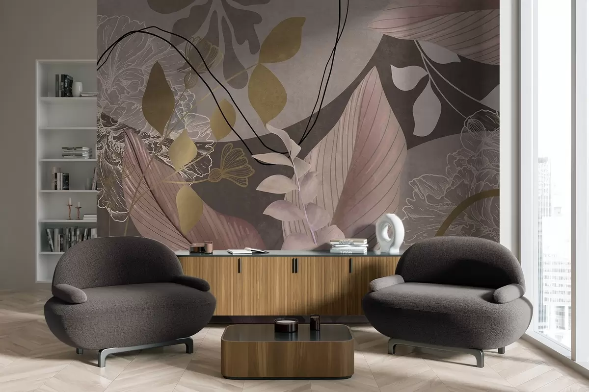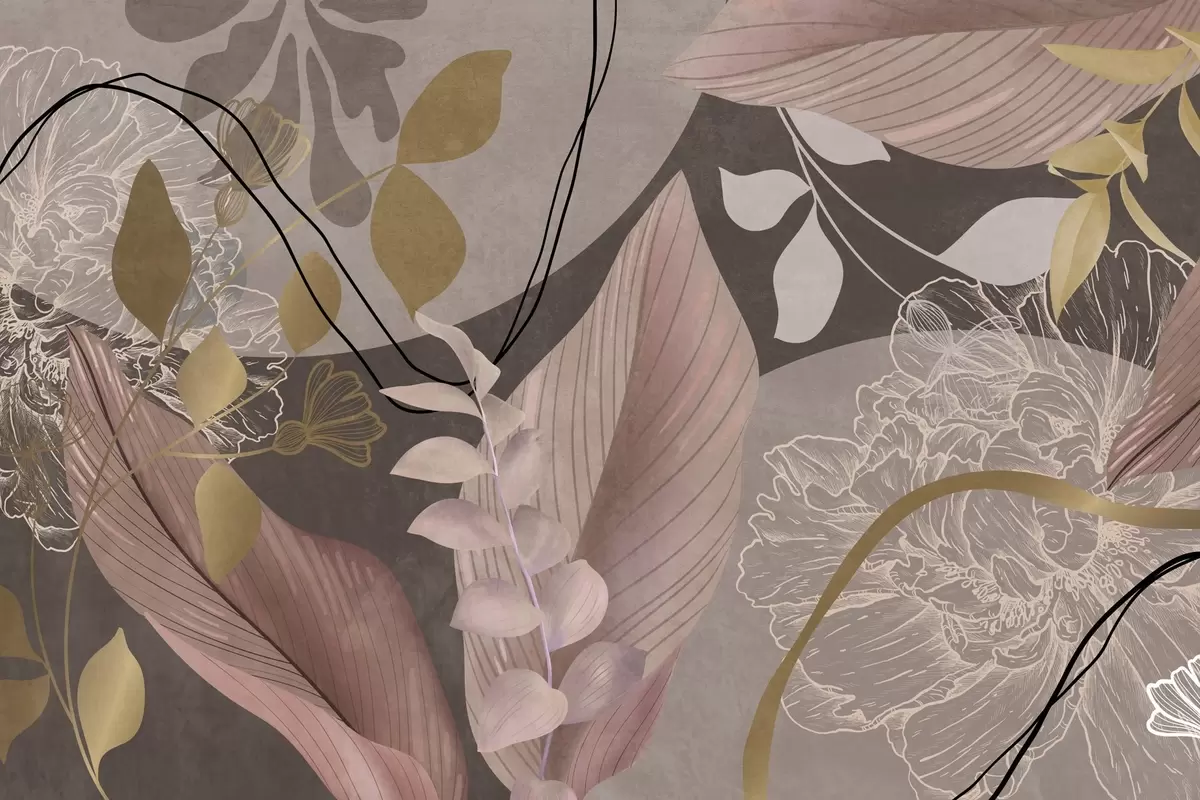 Fotomurales Estampado floral abstracto con hojas grandes en tonos rosa apagado y marrón, con finas líneas negras y contornos florales blancos. Nr. w09544
