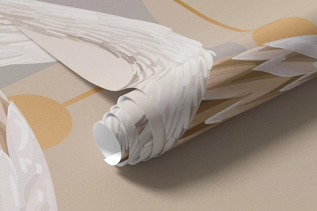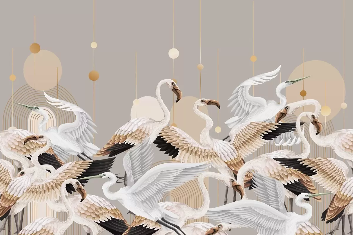 Fotomurales Una bandada de flamencos blancos con delicadas alas, sobre un fondo neutro con líneas y círculos amarillos. Nr. w09546v1