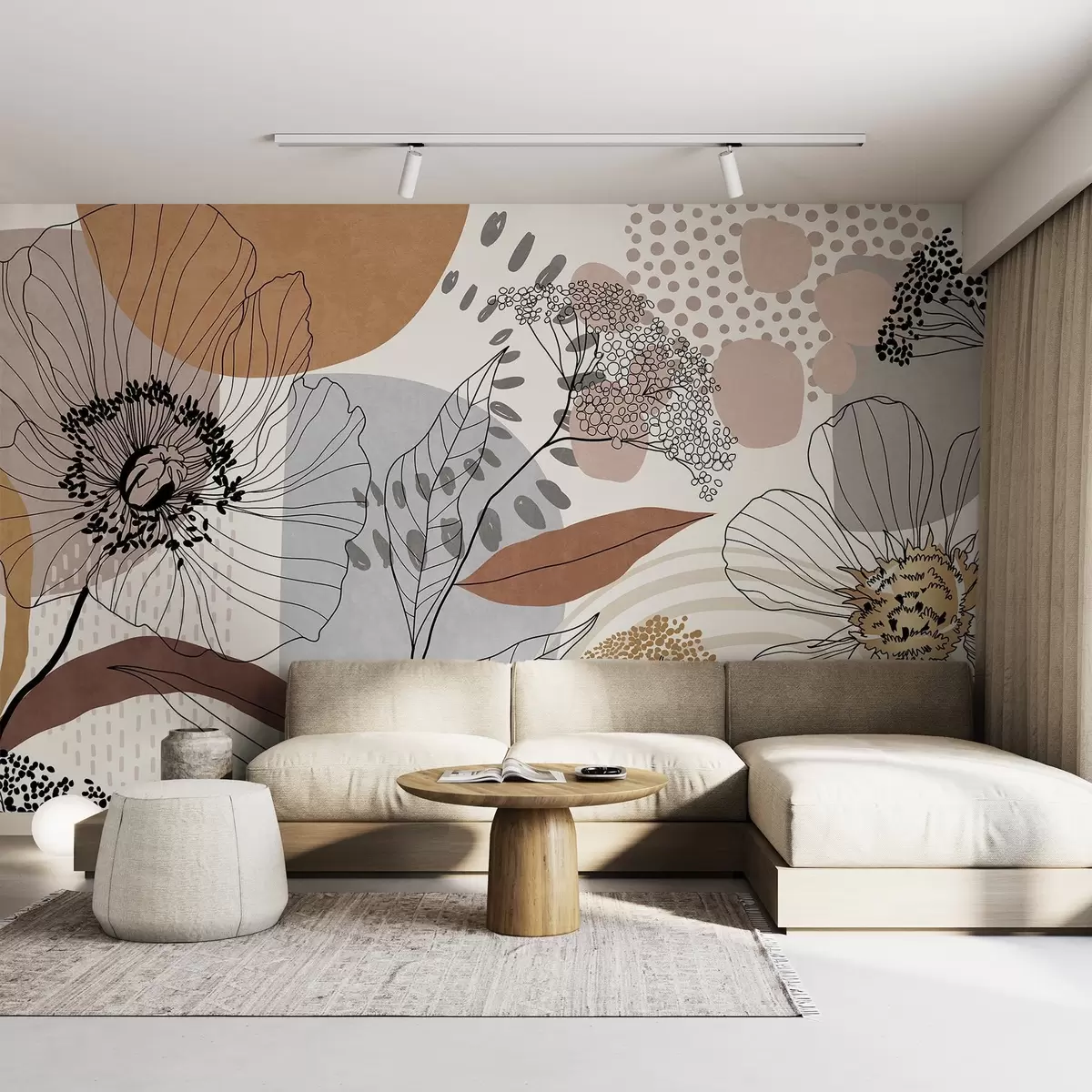 Fotomurales Estampado abstracto con textura floral, flores de trazo fino, hojas y formas orgánicas en tonos apagados de marrón, beige y gris Nr. w09548
