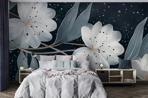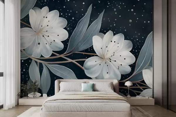 Fotomurales Flores blancas con textura fantástica, rodeadas de hojas y ramas azul verdosas sobre un fondo oscuro Nr. w09551