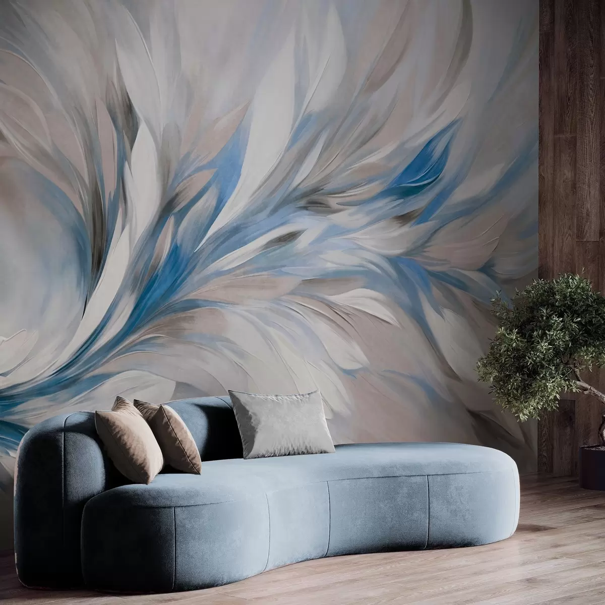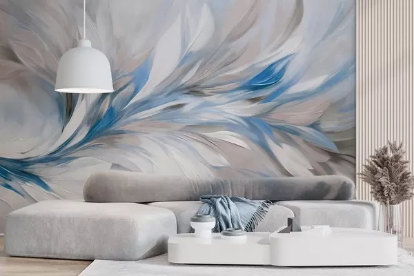 Fotomurales Estilo de pintura abstracta con pinceladas texturizadas en blanco, azul y gris sobre un fondo suave y claro Nr. w09552v1