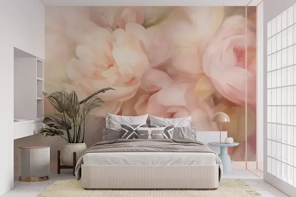 Fotomurales Peonías difuminadas en rosa pálido y crema con suaves pinceladas pictóricas, creando un arreglo floral con textura Nr. w09556