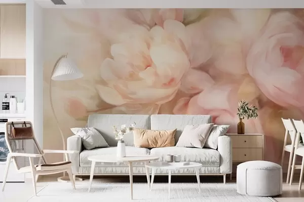 Fotomurales Peonías difuminadas en rosa pálido y crema con suaves pinceladas pictóricas, creando un arreglo floral con textura Nr. w09556