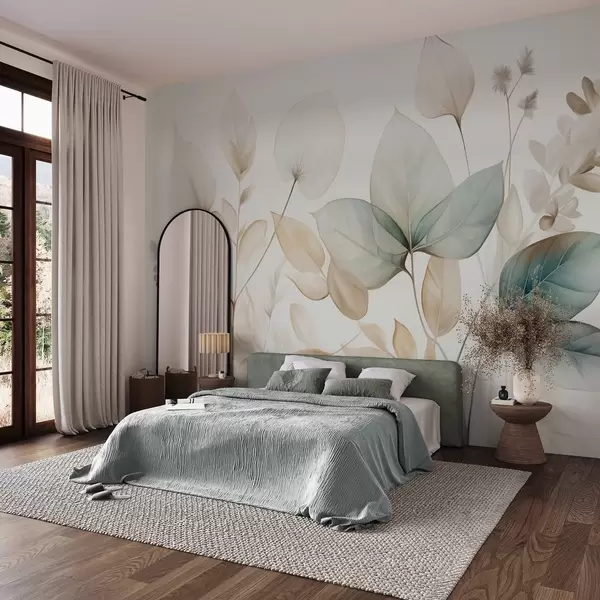 Fotomurales Hojas translúcidas con textura en tonos apagados de beige y verde azulado, con tallos delicados sobre un fondo suave y claro Nr. w09583