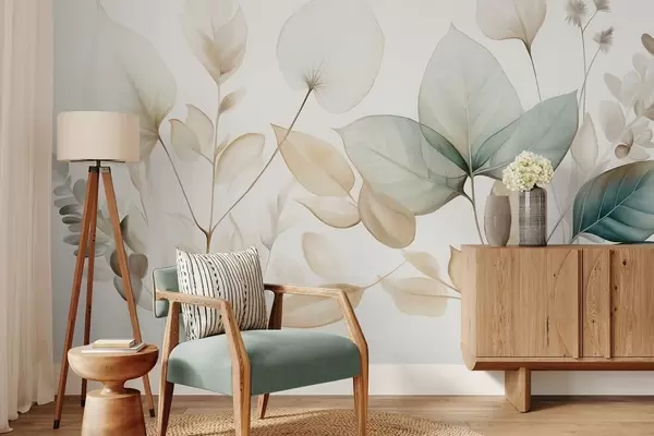 Fotomurales Hojas translúcidas con textura en tonos apagados de beige y verde azulado, con tallos delicados sobre un fondo suave y claro Nr. w09583