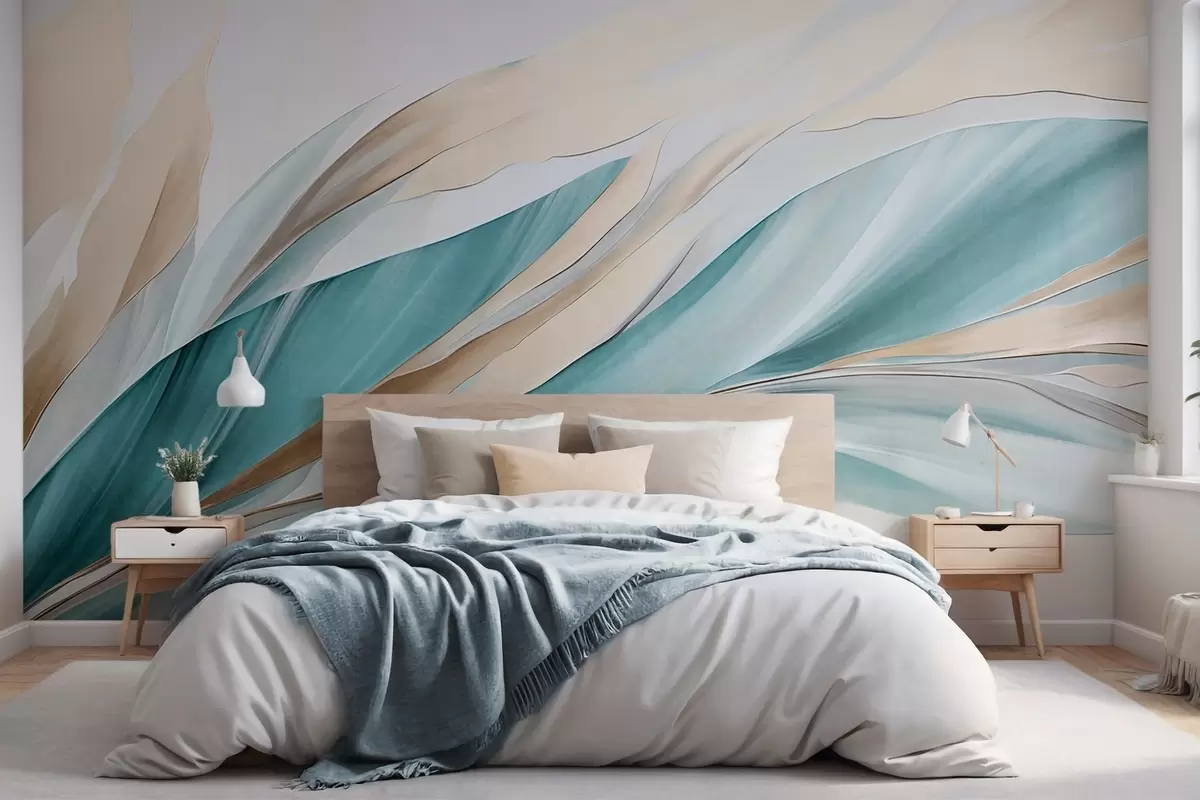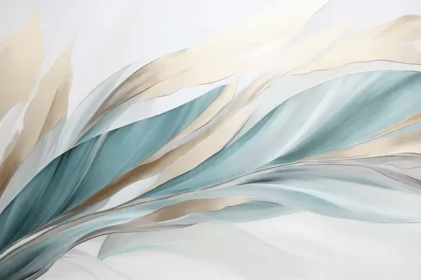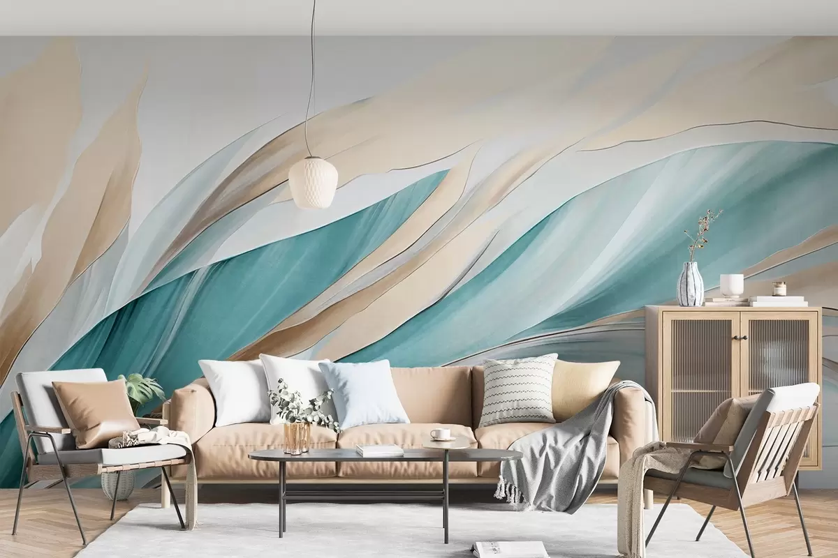 murales de pared Ondas abstractas fluidas de color verde azulado y amarillo, con formas y líneas finas, sobre un fondo blanco, arte texturizado. w09585