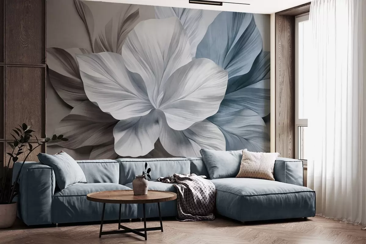 Fotomurales Flor abstracta de múltiples pétalos con hojas texturizadas en tonos marrones y azules, fondo suave. Nr. w09604v1