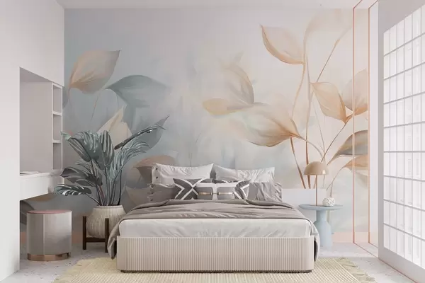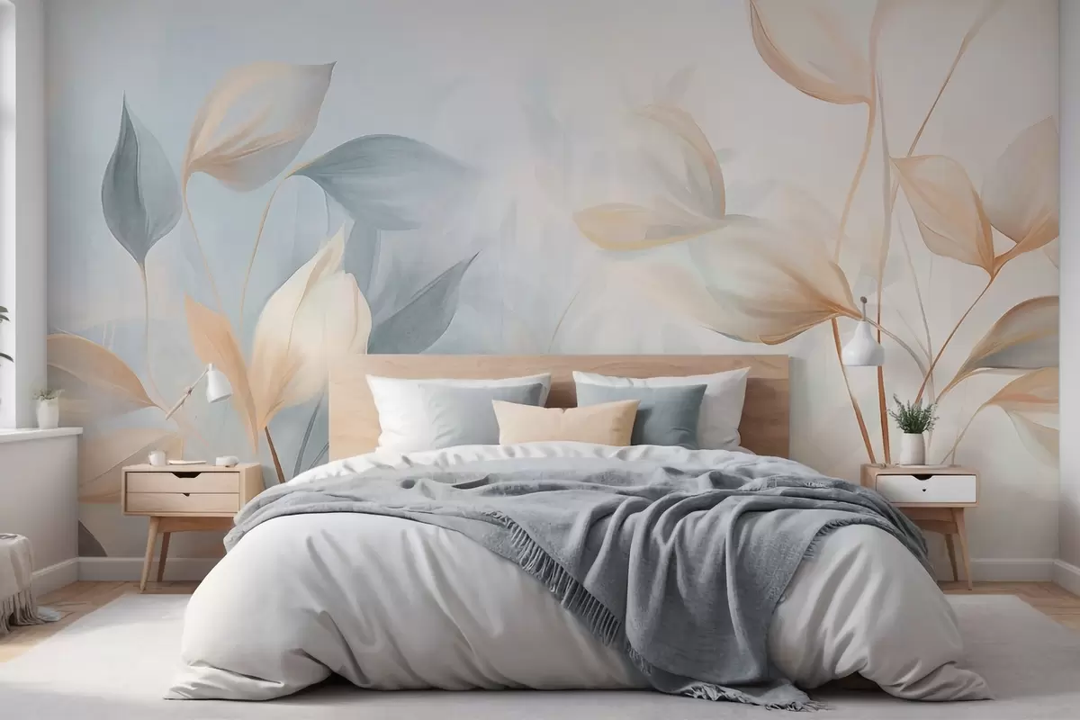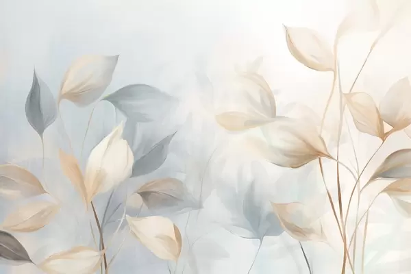 Fotomurales Hojas suaves, delicadas y translúcidas en tonos apagados de beige, melocotón y azul pálido, arte texturizado en tonos pastel. Nr. w09607