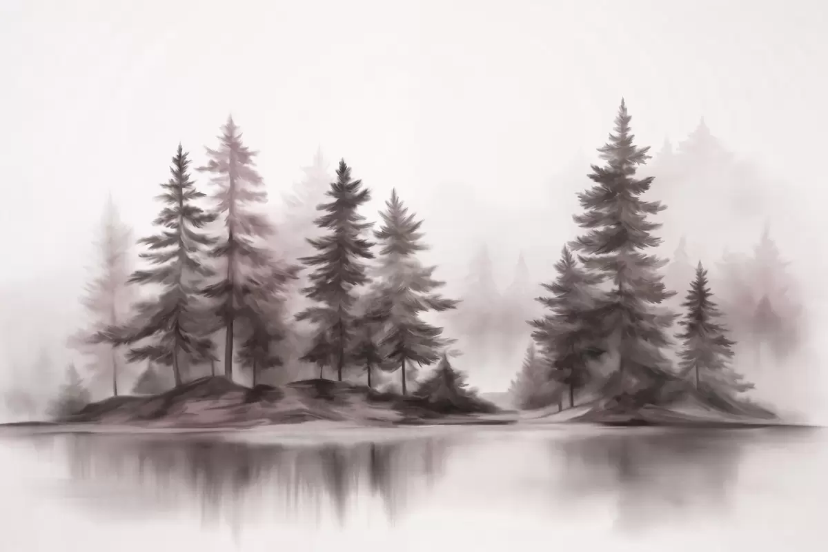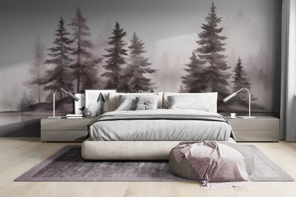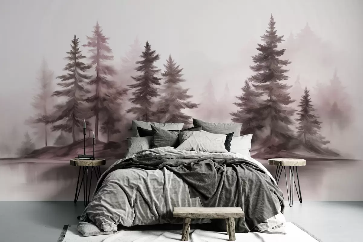 Fotomurales Un bosque brumoso con textura y altos pinos pintados de imitación. Nr. w09610v1