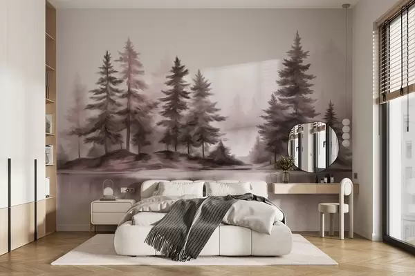 Fotomurales Un bosque brumoso con textura y altos pinos pintados de imitación. Nr. w09610v1