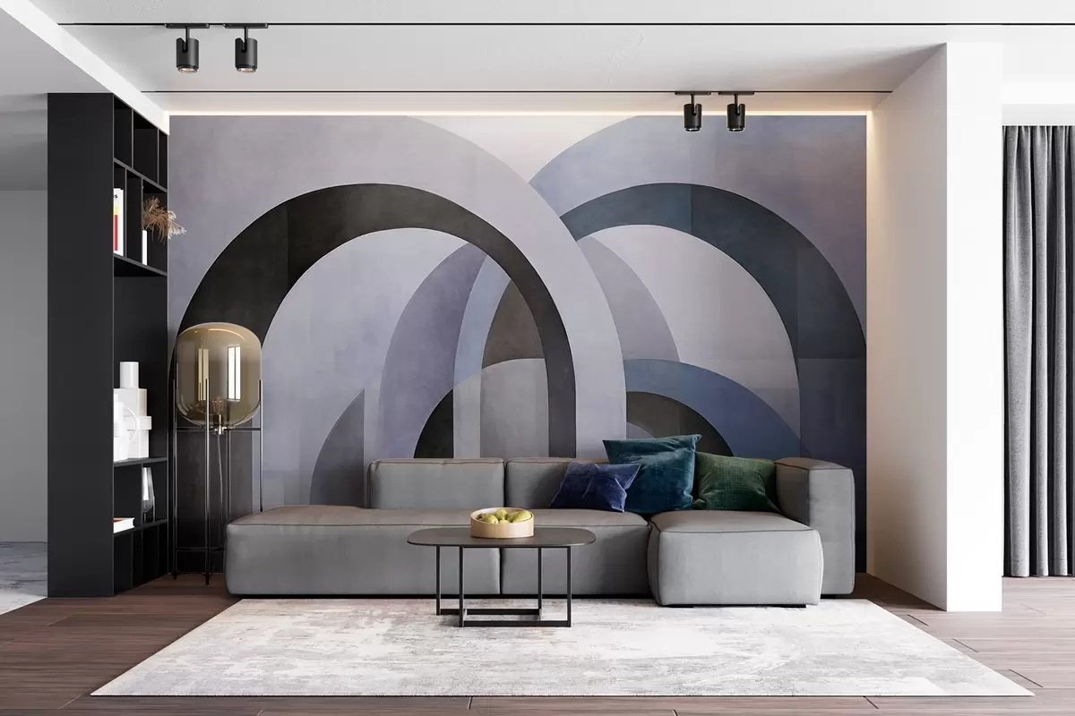 Fotomurales Arcos geométricos abstractos con textura en tonos azules, negros y grises, un diseño arquitectónico moderno en capas. Nr. w09611v1