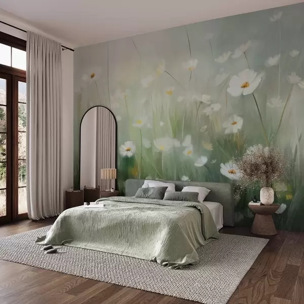 Fotomurales Campo abstracto de margaritas blancas con hierba verde y un fondo suave y difuso en estilo pictórico. Nr. w09619