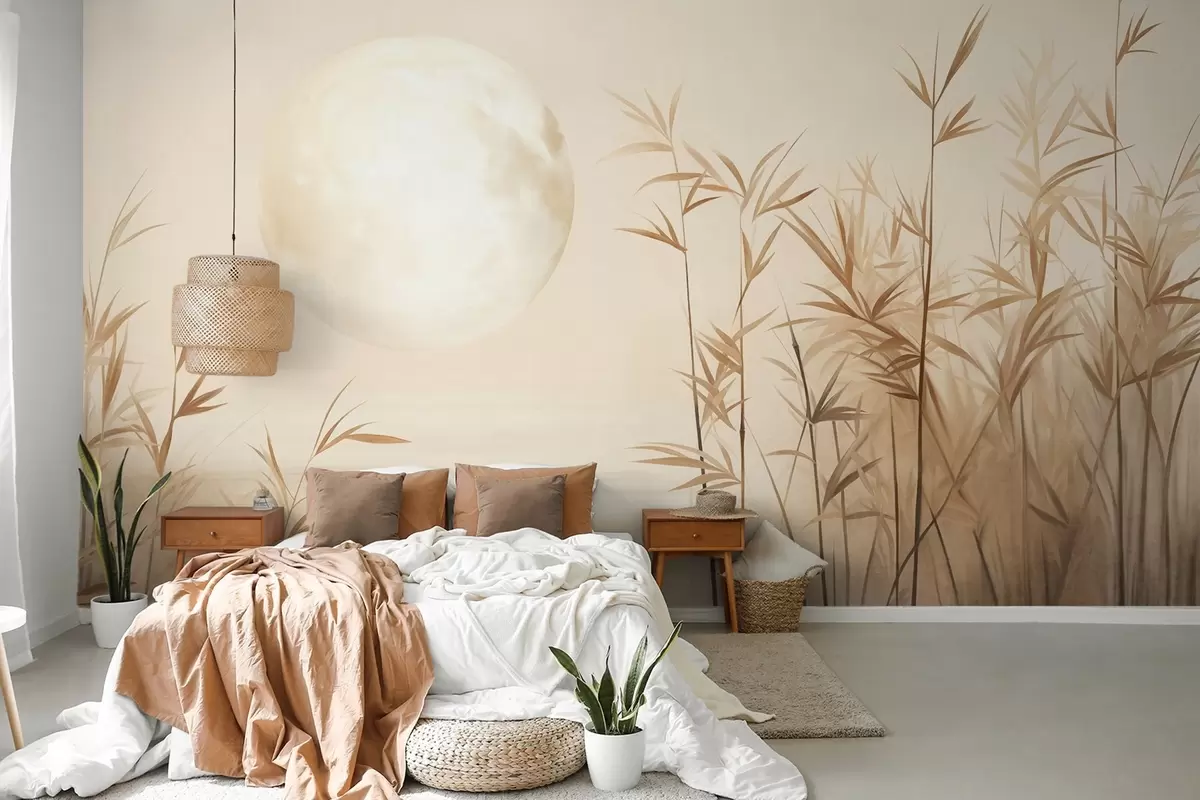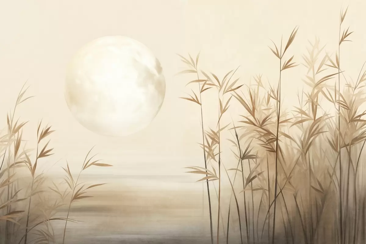 Fotomurales Paisaje texturizado con altos juncos, lago y luna pálida en un cielo brumoso. Nr. w09631