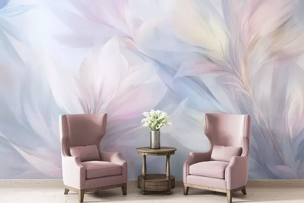 Fotomurales Hojas suaves en tonos pastel y plumas en tonos rosa, azul y amarillo, estampado abstracto y con textura. Nr. w09634
