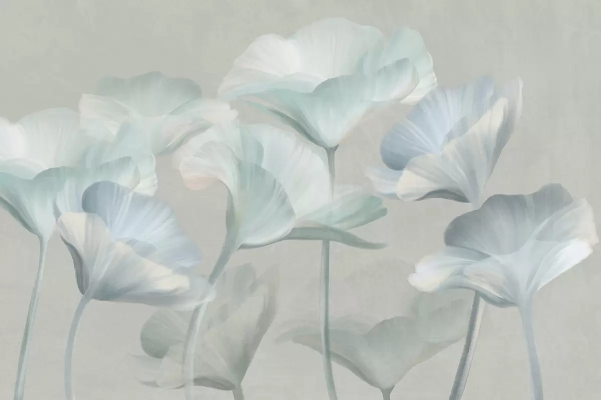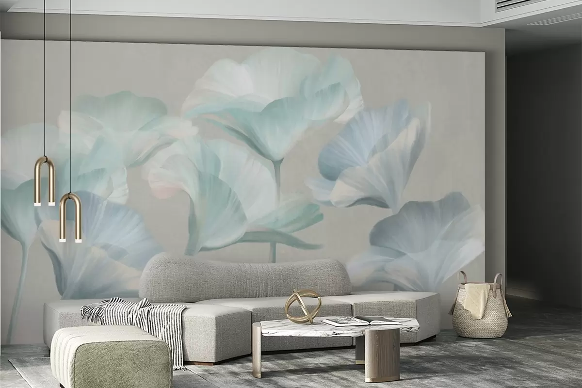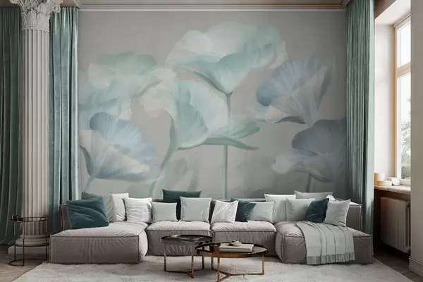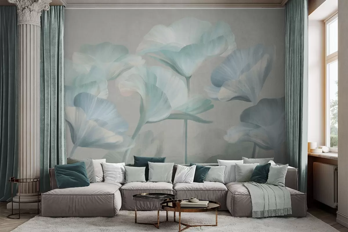 Fotomurales Flores de loto translúcidas de color turquesa pálido con pétalos delicados sobre un fondo gris apagado. Nr. w09640v2