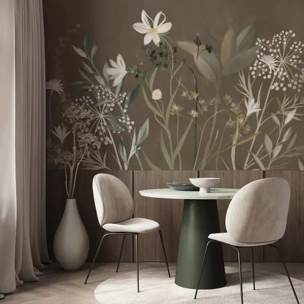 Fotomurales Delicadas flores silvestres y follaje con textura en tonos verdes y crema apagados sobre un fondo marrón. Nr. w09641v1